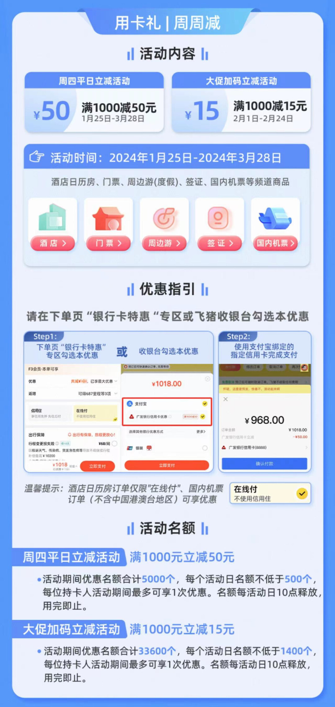 活动一:2024年1月25日至3月28日,每周四10点起,广发信用卡绑定支付宝在飞猪购买指定商品,满1000-50元。