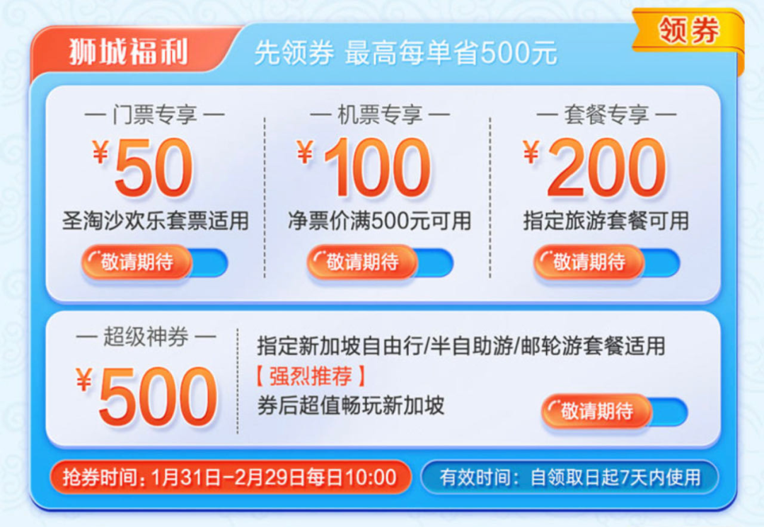 2024年1月31日至2月29日,每日早上10点,限量抢新加坡门票/机票/旅游套餐满减券,最高立减500元。