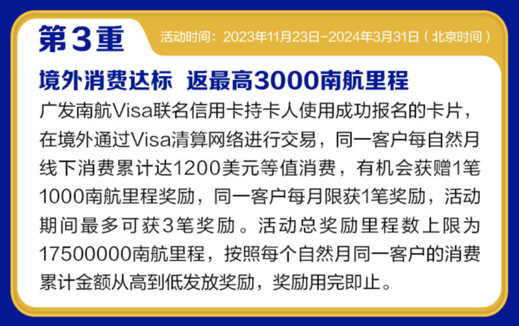 活动二:2023年11月23日至2024年3月31日,境外消费达标返最高3000南航里程。