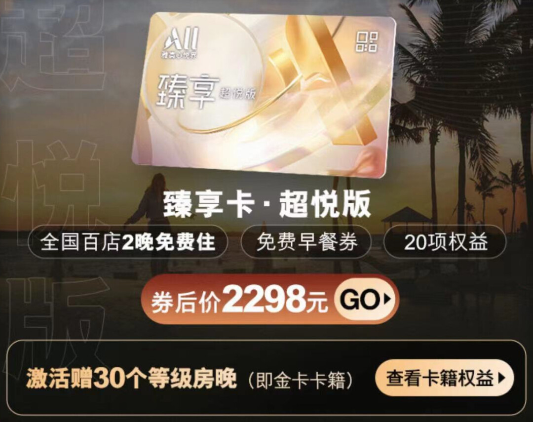 大促期间购买并激活一张雅高臻享卡·超悦版送30个房晚(每位会员在一个日历年内累计不超过30个房晚),可直升雅高心悦界金卡!