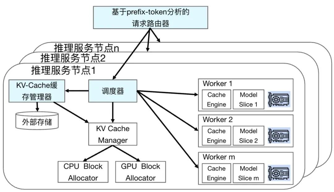 **Prefix Caching,基于prefix-token的kv-cache缓存调度(优化 γ):**将相同输入部分的计算提前进行,减少重复计算,提升batch内请求的相同prefix-token长度。通过基于prefix-token分析的请求路由器和kv-cache缓存管理器实现。