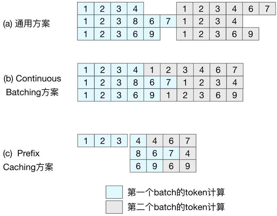 ContinousBatching 方案的调度仍然是请求粒度,并未对请求输入内容进行针对性优化。如图 1 (a,b) 所示,所有请求的前三个 token 都是 (1,2,3),我们称请求的相同输入部分为 prefix-tokens。在当前的调度逻辑下,prefix-tokens 的计算在每个请求的计算中都会被执行,而在当前主流的 decoder-only 的模型结构下,prefix-tokens 的计算结果以及对后续 token 计算结果的影响是相同的,也就是说对 prefix-tokens 的计算只需要进行一次。