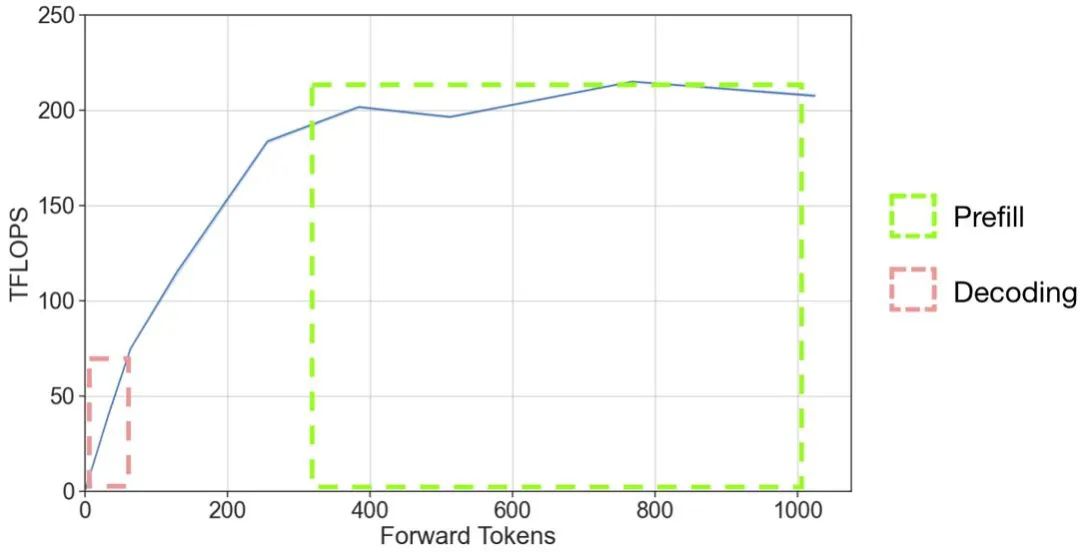 从图 1 中,我们可以标出两个阶段所处的工作区间。在输入的 token 数超过 300 的情况下,prefill 阶段可以处于 GPU 全力工作的区间,而由于 decoding 阶段一个请求每次输入的 token 只有一个,则处在 GPU 极大浪费的状态。decoding 阶段如果要达到 GPU 计算资源的充分利用,batch size 应该增大到 300 左右。然而,实际情况下由于 GPU 显存的限制,batch size 远远小于这个数。