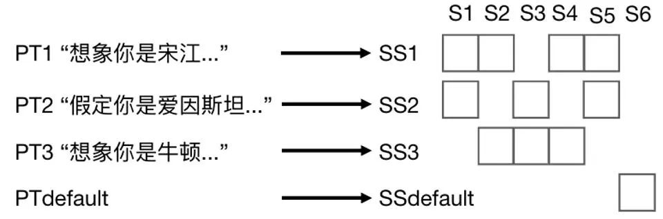 在传统的分布式系统中,请求路由器主要考虑后端服务节点的请求响应和负载情况进行请求分发。为了提高后端服务节点 prefix-tokens 缓存的命中率,在路由模块上增加根据 prefix-tokens 路由的策略,构造了下图所示的路由表。其中 PT 代表 prefix-tokens,用 PTi 表示第 i 个 prefix-tokens。同时我们用 S 表示请求的服务节点 Server,用 Sj 表示第 j 个节点。用 SS 表示多个服务节点的集合 ServerSet,用 SSk 表示第 k 个 ServerSet。
