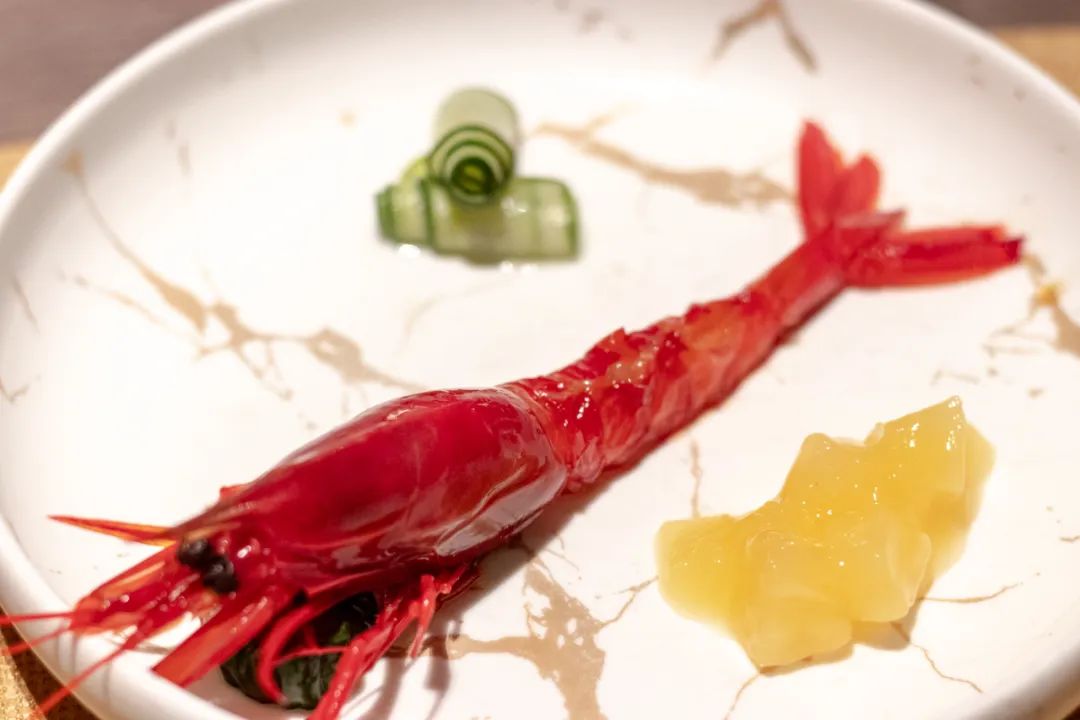 酒渍玫瑰虾青瓜咸酸(前菜):虾处理得很干净,带着浅浅的酒香,搭配着咸酸入口,层次丰富口感特别。