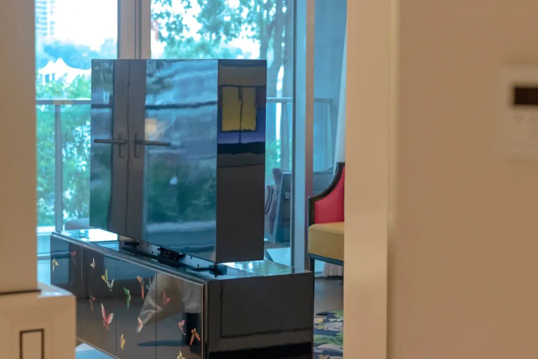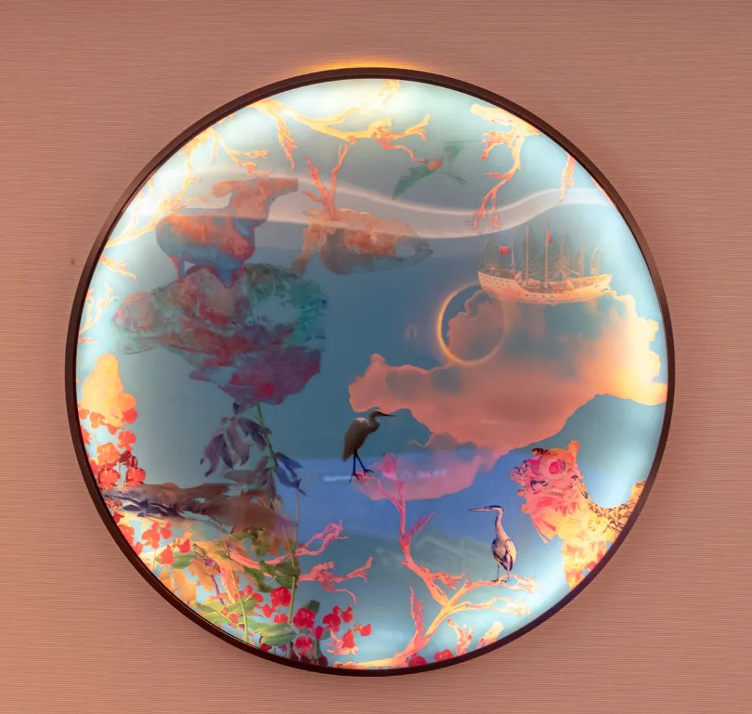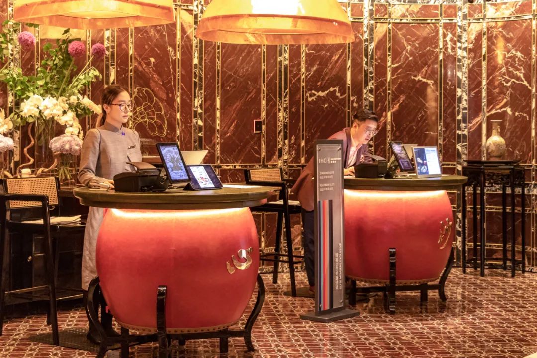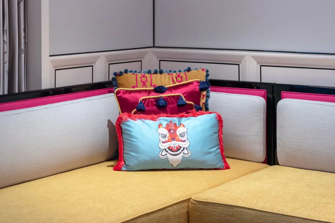 缓缓步入大堂,犹如走进了一座私人大宅。前台以龙舟鼓的造型呈现,鼓上印着“海心沙”三个大字。