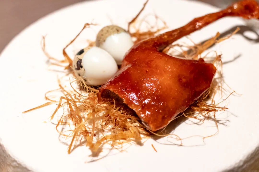 玻璃润皮乳鸽(主菜):本年度吃过的乳鸽No1,一口咬开,脆皮且汁水丰富,真想打包一整只回房间宵夜啊。