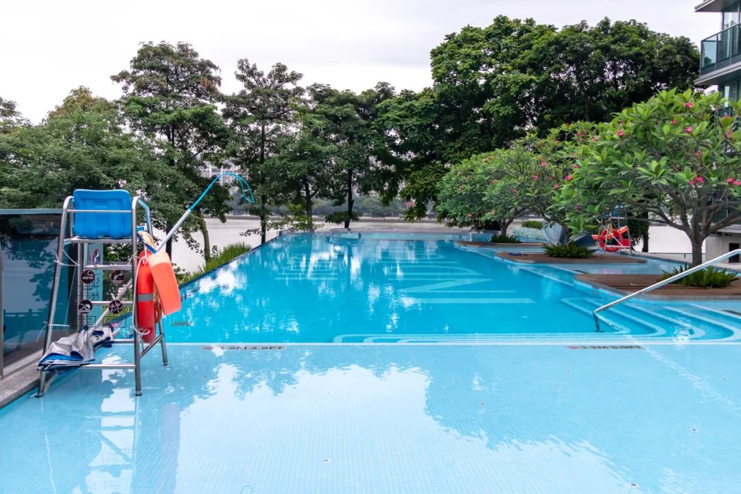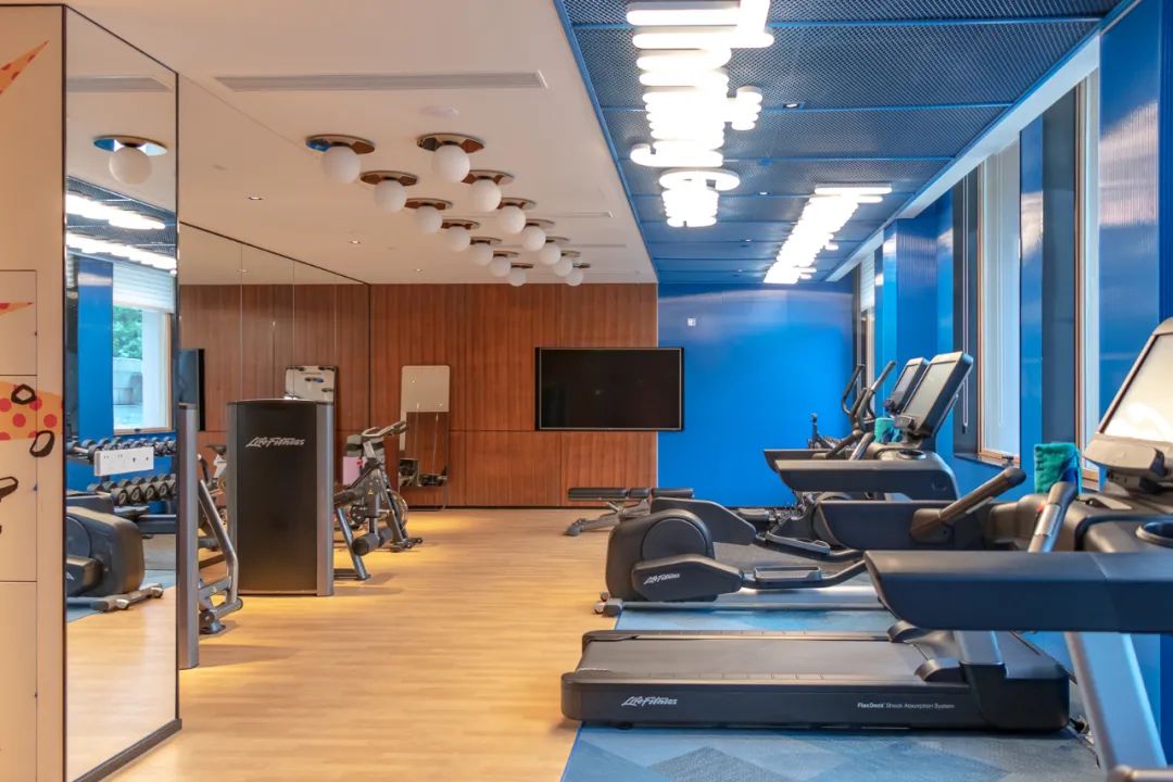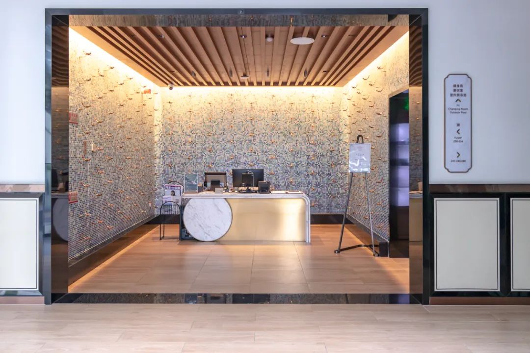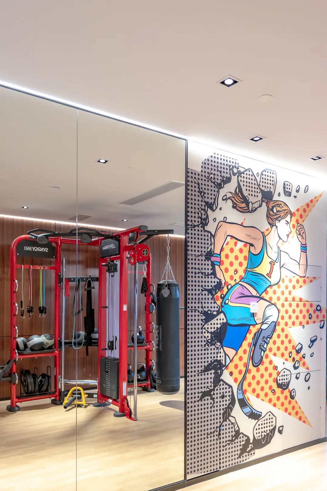 康体中心位于主楼二楼,接待区用“跳水小金人”装饰满墙,活力又很可爱。室内健身房设备齐全,户外无边恒温泳池,举目可眺小蛮腰。