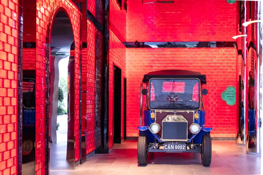 停车场有定点接送客人往返酒店大堂,可爱的复古接驳车载着我们经过茂密的芒果林、酒店客房楼栋,到达大榕树下。