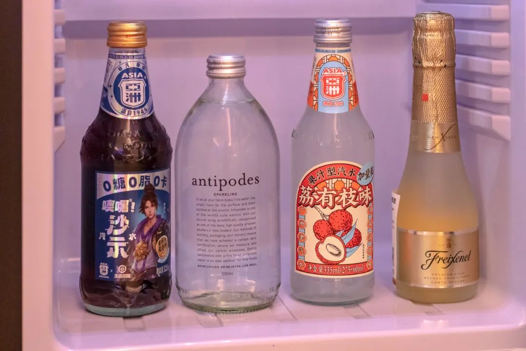 Minibar首轮免费提供,看到沙士汽水的我表示,酒店选品是真有眼光!而小姐妹则是想着晚上泡澡时,小酌几杯起泡酒。