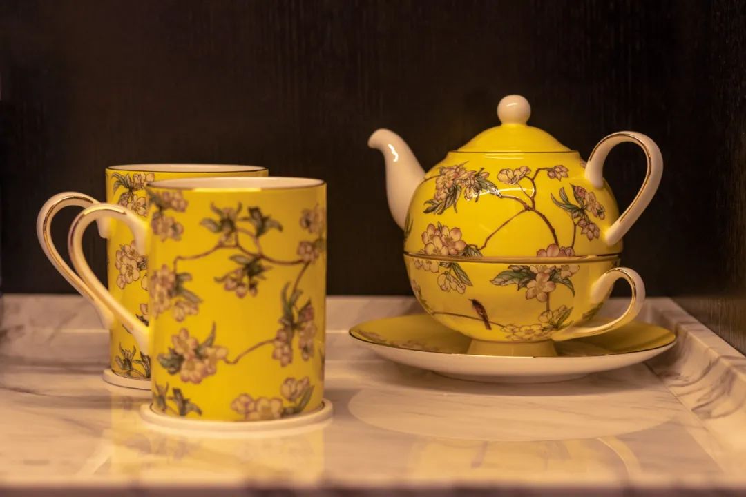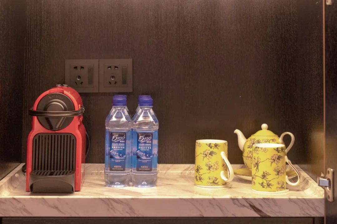 木质雕花柜中藏置着饮用水、水壶及Nespresso胶囊咖啡机等。
