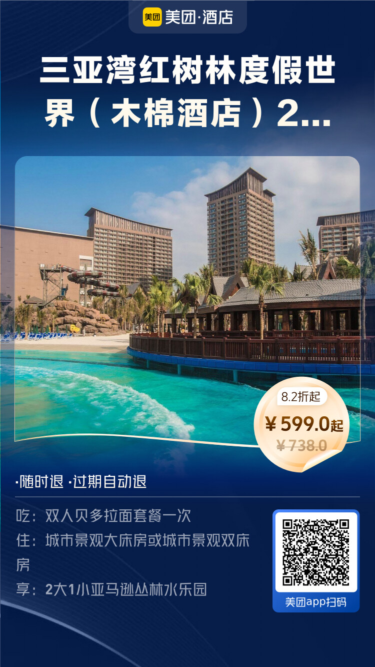 三亚湾红树林度假世界(木棉酒店)2晚+2大1小亚马逊丛林水乐园+双人贝多拉面套餐一次 - 599元