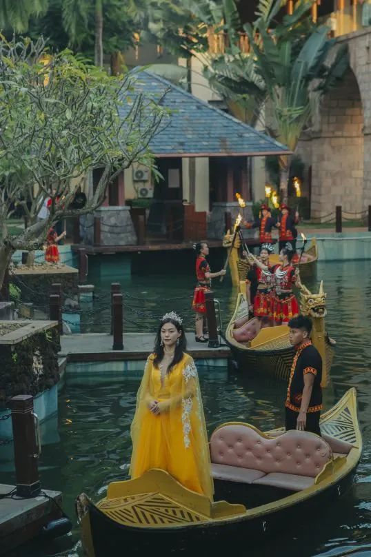 除了无敌海景外,住这家还能收获满满的仪式感,尤其是标志性的“日落仪式”:太阳下山的时候,阳光通过酒店落客区龙门穿过廊桥直射进入大堂,使得整个廊桥给人一种日落穿廊的感觉,酒店希望向所有客人展示当地黎族同胞对火与太阳的崇拜。歌剧与黎族点火仪式相结合,可参与现场互动,有小礼物,免费饮品。
