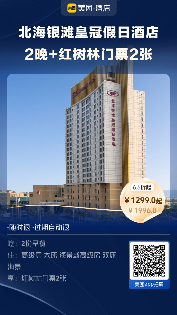 北海银滩皇冠假日酒店海景房2玩+双早+红树林门票2张 - 1299元
