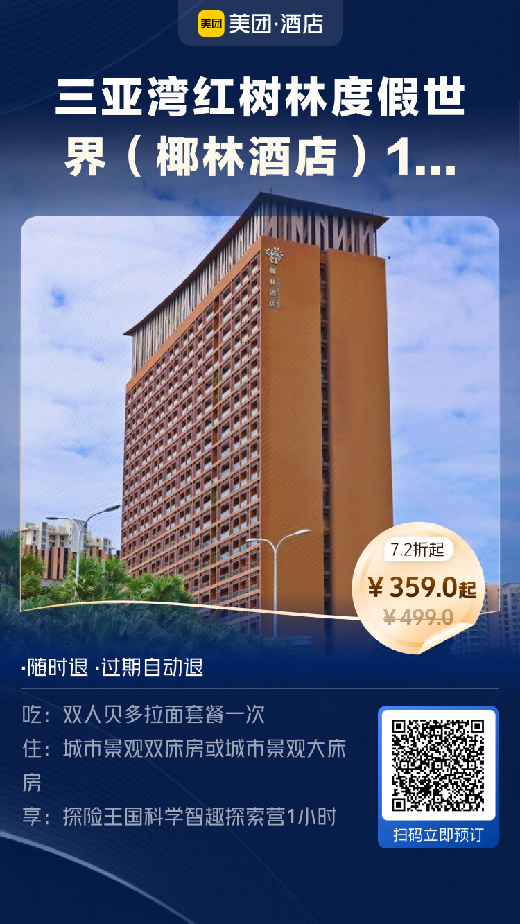 三亚湾红树林度假世界(椰林酒店)1晚+探险王国科学智趣探索营1小时+双人贝多拉面套餐一次 - 359元