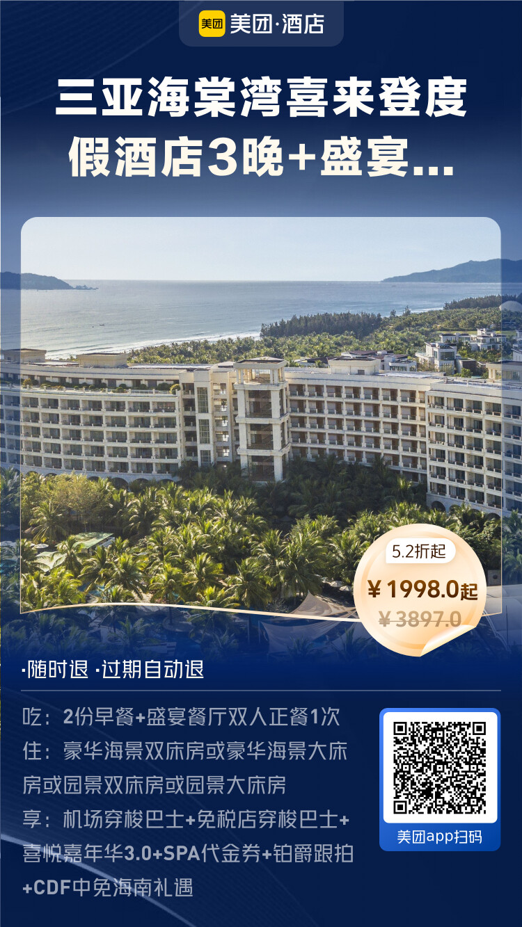 亚龙湾适合玩水,海棠湾适合看海(因为浪大,不能下水)。这款套餐的亮点在于海景房,海棠湾的酒店有没有海景实在太重要了,毕竟住海棠湾的目的就是为了看海。1999元3晚海景房,单晚600元+,且送早餐和正餐,这个价格算是历史好价,之前大促貌似也没有这样的价格。可以入手。