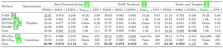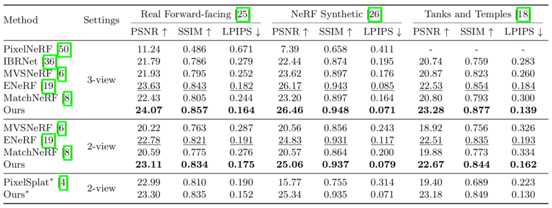 表 2 Real Forward-facing、NeRF Synthetic 和 Tanks and Temples 数据集上的泛化定量结果。