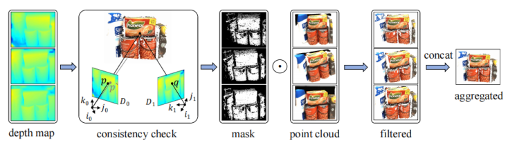 图 4 一致性聚合。使用可泛化模型生成深度图和高斯点云,我们首先对深度图进行多视图几何一致性检查,以得到用于过滤不可靠点的 mask。随后,将经过滤的点云拼接成一个点云,作为逐场景优化的初始化。