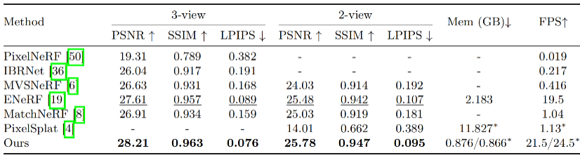 然而,3D-GS 同样依赖于每个场景的优化,每个场景需要几十分钟的时间。为了解决这个问题,后续出现了一些泛化性的高斯重建工作,尝试将 3D-GS 推广到未见过的场景,然而,这些方法的训练和渲染效率还有待提升且主要局限于物体或人体的重建。