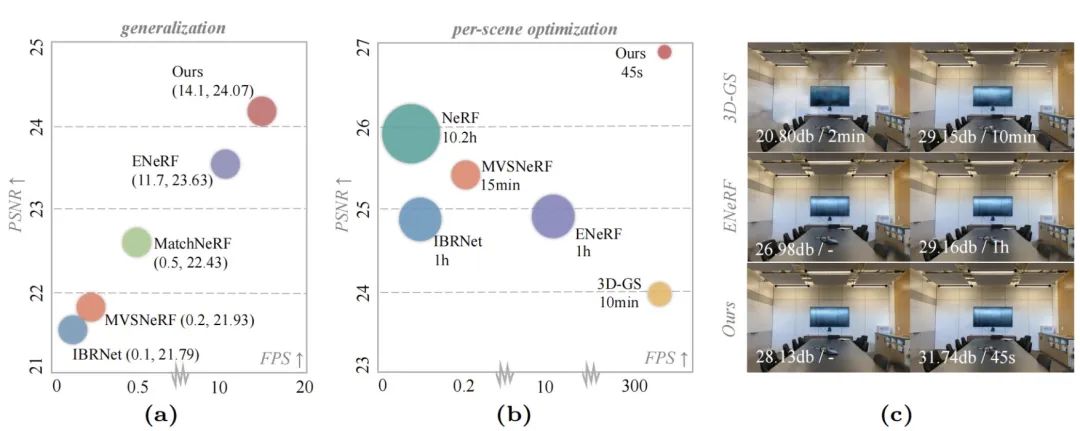 图 1 无论是泛化推理还是逐场景优化,MVSGaussian 在视图质量、渲染速度和优化时间都表现出了明显的优势。