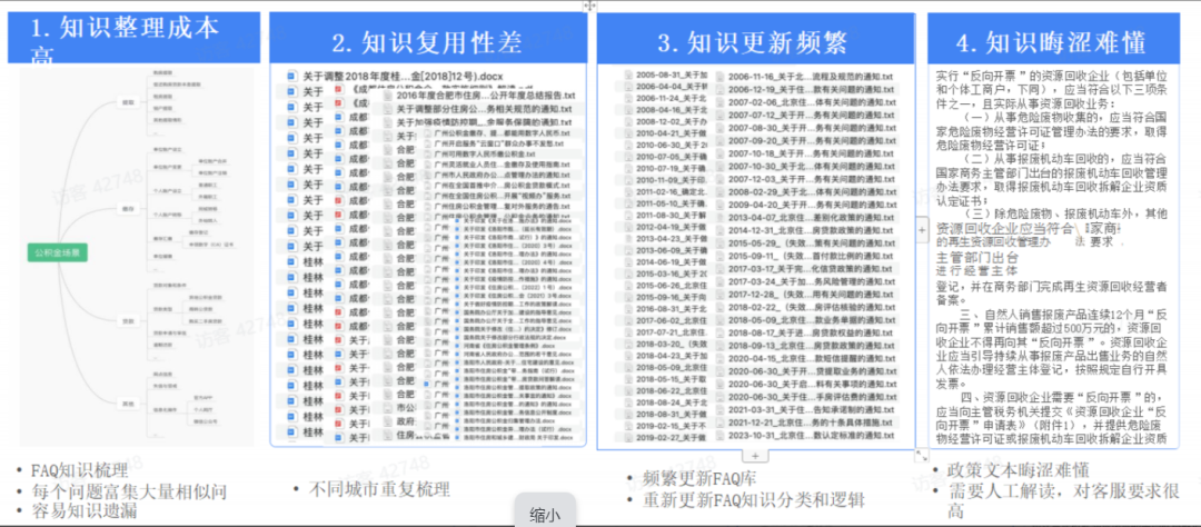 3.知识更新频繁。各市每年都会有年度政策版本出台,每隔几个月还会有补充性政策,增加维护成本。4、知识晦涩难懂。虽然涉及日常场景,但政策内容复杂,不易为大众理解。
