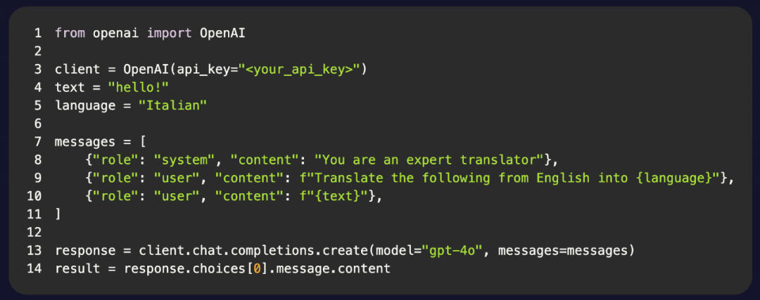 下面是一个仅使用 OpenAI 软件包的 Python 示例: