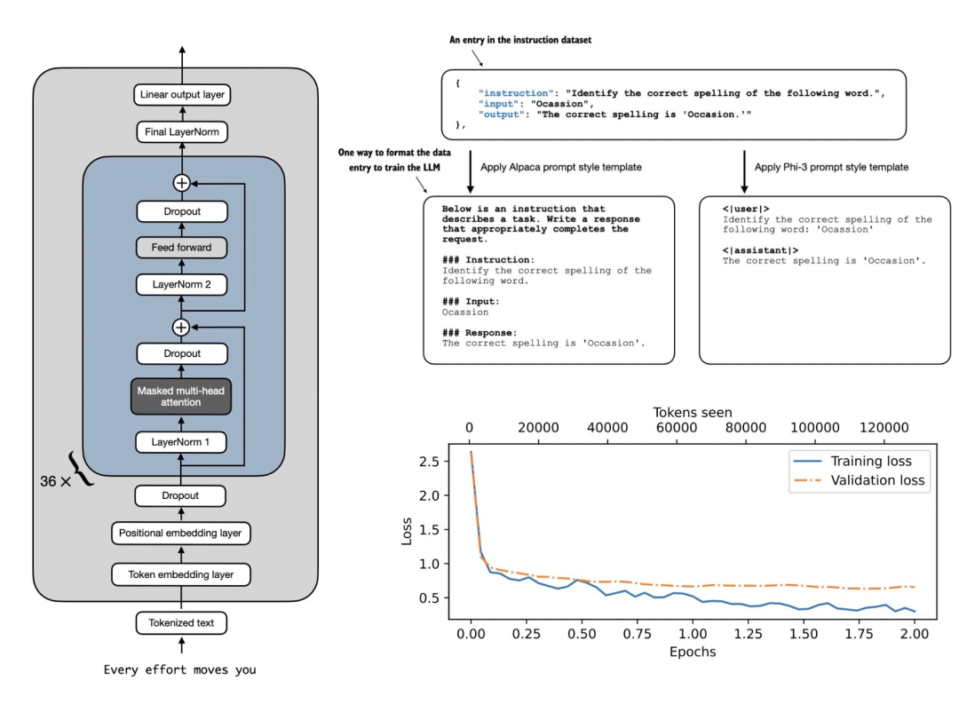 《Build a Large Language Model (From Scratch)》用清晰的文字、图表和示例解释每个阶段,从最初的设计和创建,到采用通用语料库进行预训练,一直到针对特定任务进行微调。