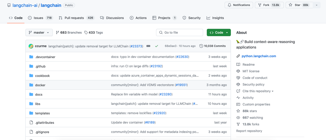 综上所述,LangChain 允许开发者根据自己的需求直接与大模型互动,开发一个大模型应用不再遥不可及。作为一个开源框架,LangChain 仅发布数月便成为 GitHub 上的热门项目,截至目前已揽获 80k+ 的星标数。