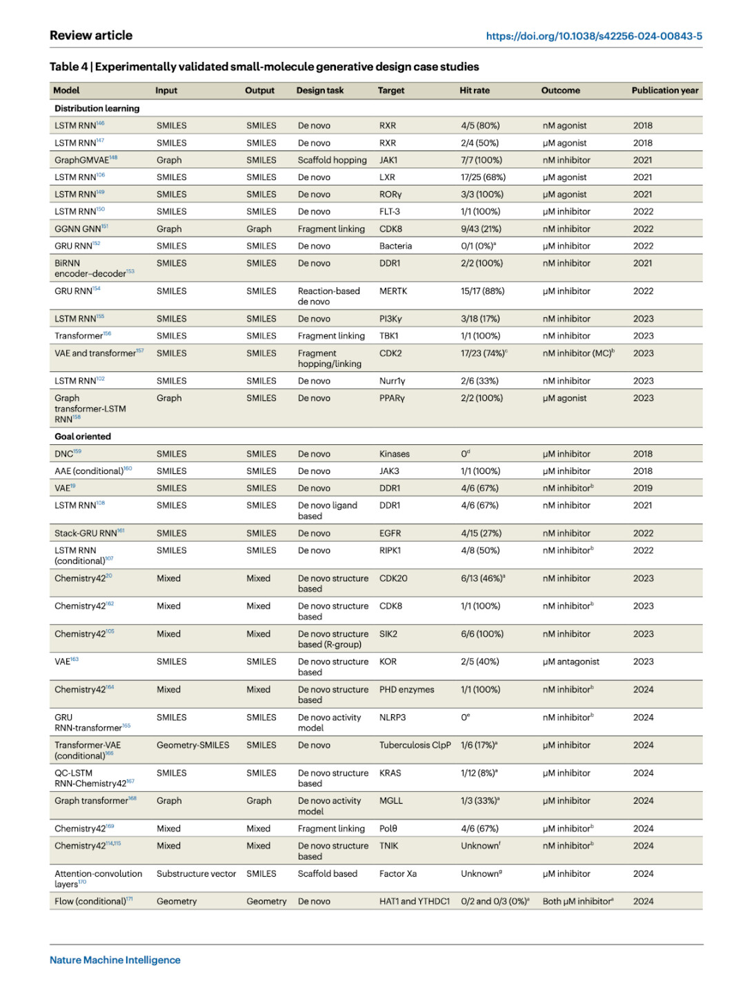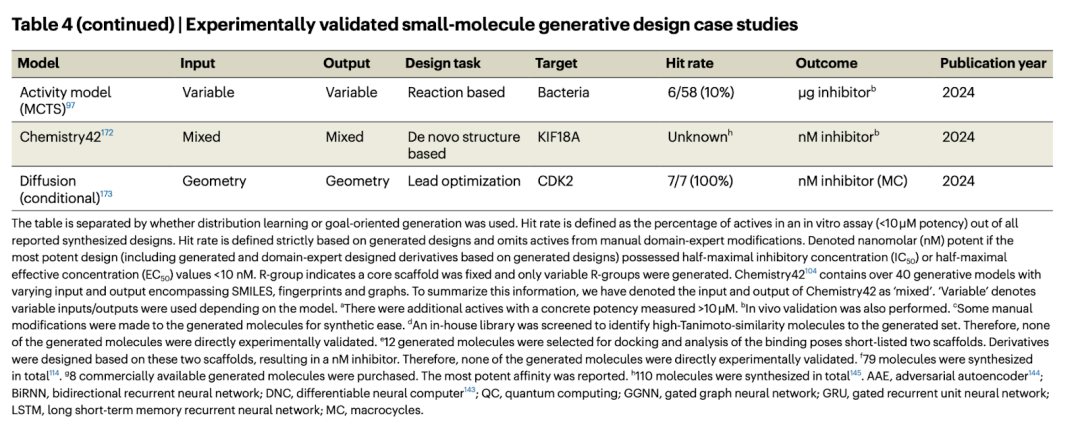 大多数报告实验验证的研究使用 RNN 和/或 VAE,并以 SMILES 作为操作对象。我们总结了四个主要观察点: