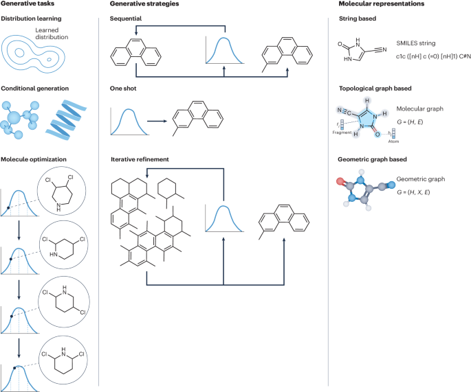 图示:生成任务、生成策略和分子表征的图示。