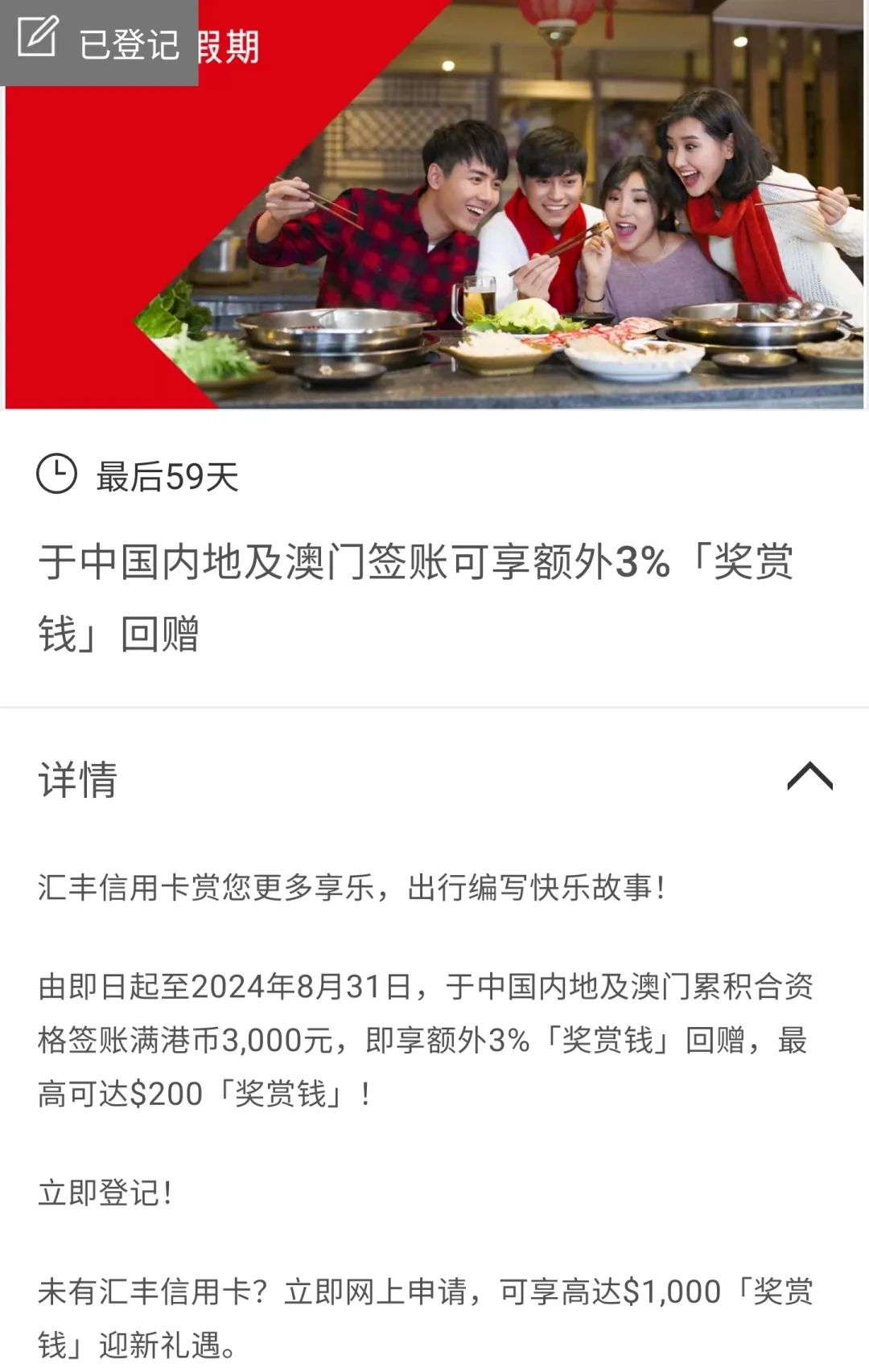 即日起至2024年8月31日,于中国内地及澳门累积合资格签账满港币3,000元,即享额外3%「奖赏钱」回赠,最高可达S200「奖赏钱」!