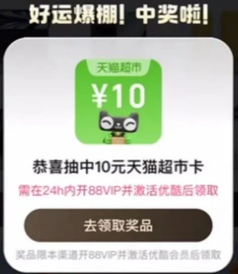 先抽奖,必中10元猫超卡。当然你运气够好的话,也能中到大奖(实话实说,概率很低)。然后根据指引开通88vip,并激活优酷会员,即可领取10元猫超卡。