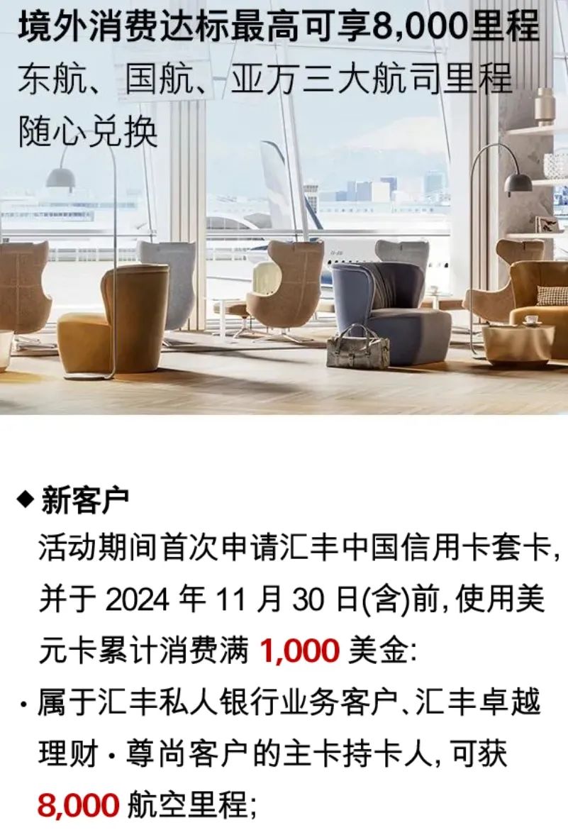 境外消费满1000美元最高送8000里程。活动时间6月11日至9月30日。在此期间申请汇丰中国信用卡套卡的新户,在11月30日之前用美元卡消费满1000美元,私行、尊尚客户可以获得8000里程,卓越客户可获得5000里程。已持卡老户福利相同,只是消费达标需要在9月30日之前完成。