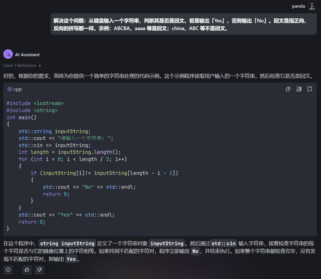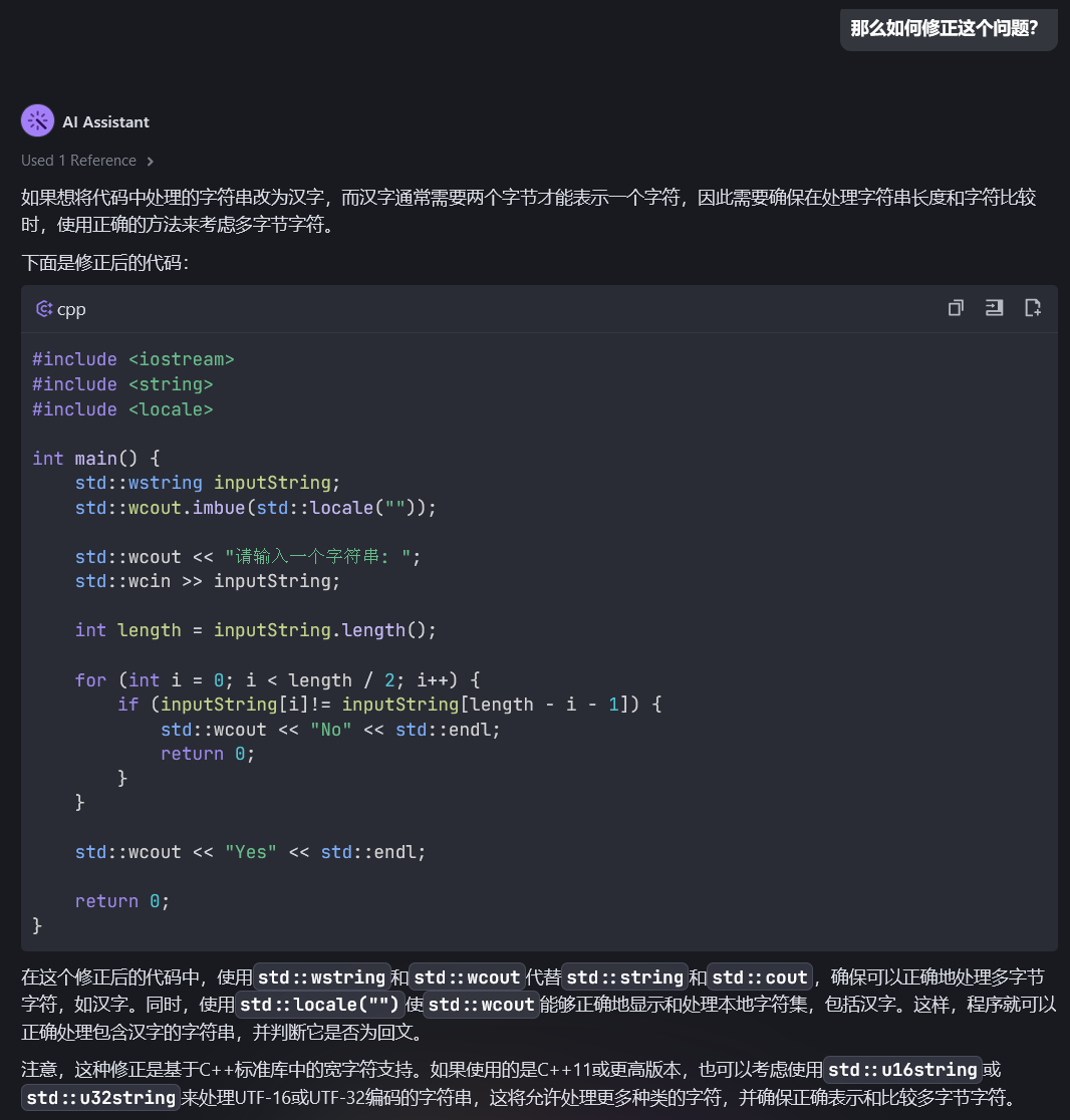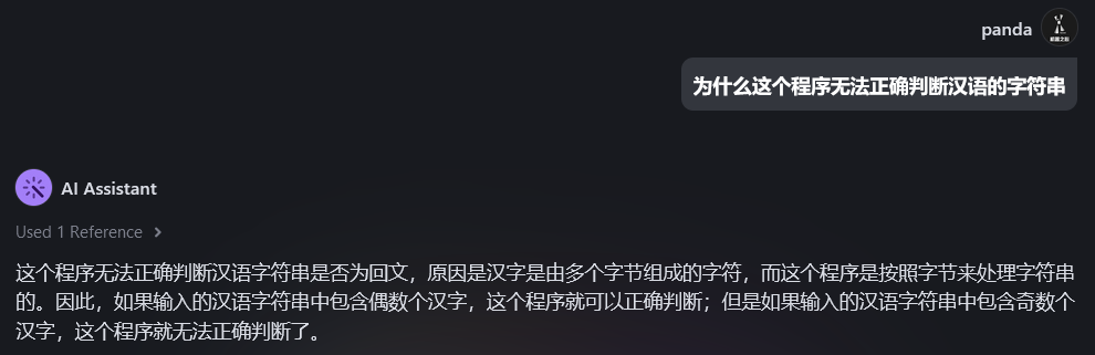 运行该代码,然后输入汉语回文,我们会发现该程序并不能正确判断。原因是什么呢?向豆包MarsCode 提问一下。