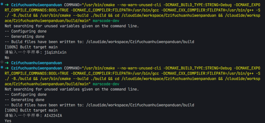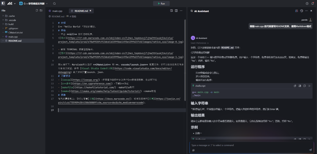 点击运行按钮,使用字符串测试。豆包MarsCode 生成的代码会立刻开始工作,准确地判断出你输入的字符串是否是一个回文。可以看到豆包MarsCode 生成的代码正确地完成了预期任务。