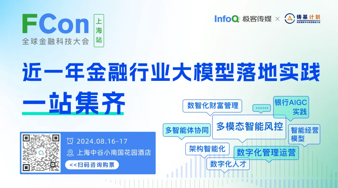 8 月 16-17 日,FCon 全球金融科技大会将在上海举办。本届大会由中国信通院铸基计划作为官方合作机构,来自工银科技、北京银行、平安银行、广发银行、中信银行、度小满、蚂蚁集团等金融机构及金融科技公司的资深专家将现身说法分享其在金融科技应用实践中的经验与深入洞察。