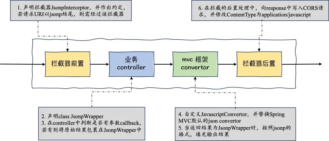 1.声明自定义拦截器JsonpInterceptor,若请求URI以jsonp结尾,则需经过该拦截器