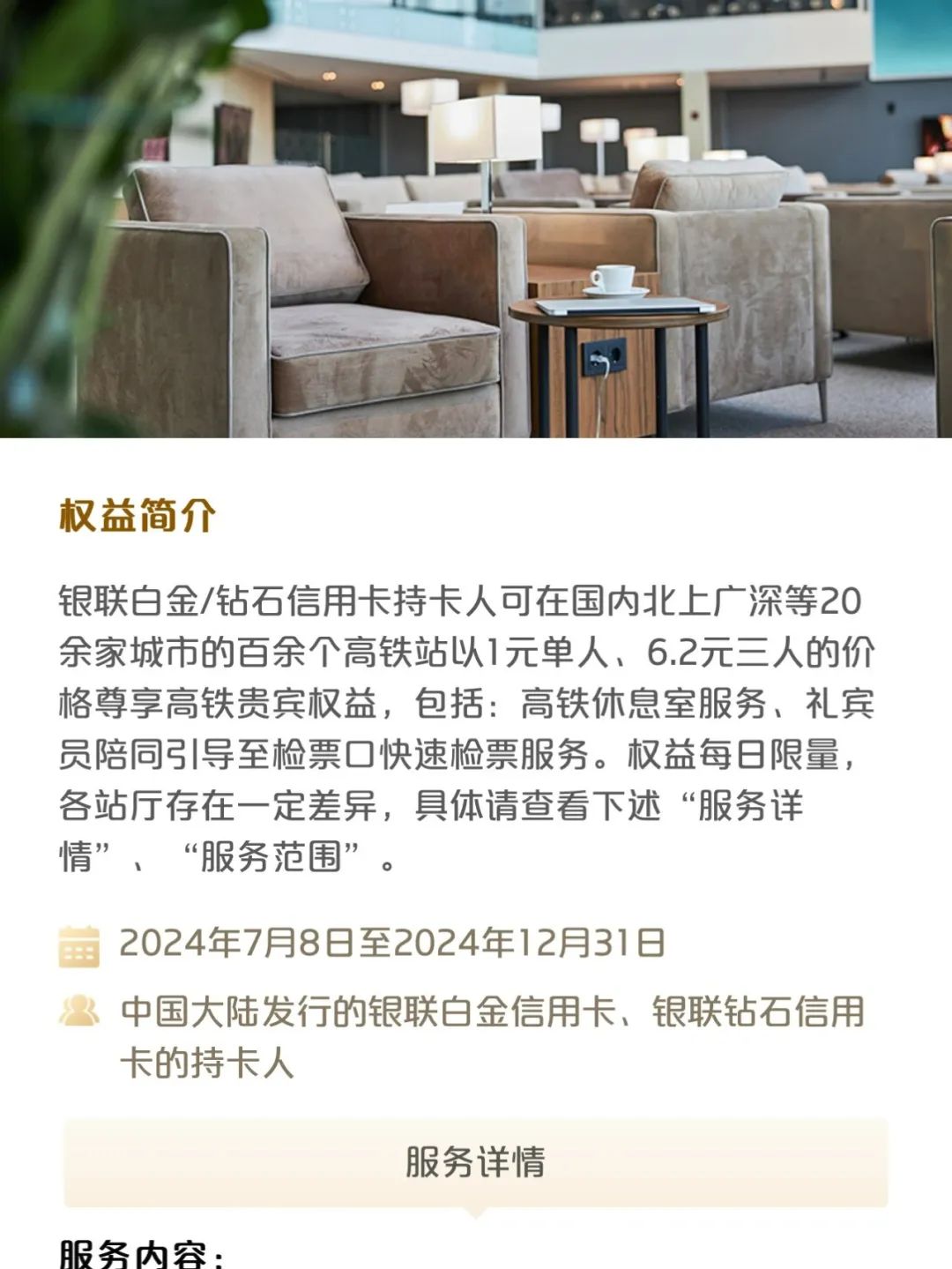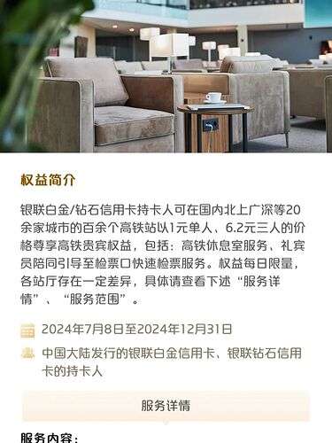 🗂️ 活动内容:银联 62 开头白金、钻石卡可以在 50 余家机场、20 余家高铁站以 1 元单人、6.2 元三人的价格享受贵宾室权益。