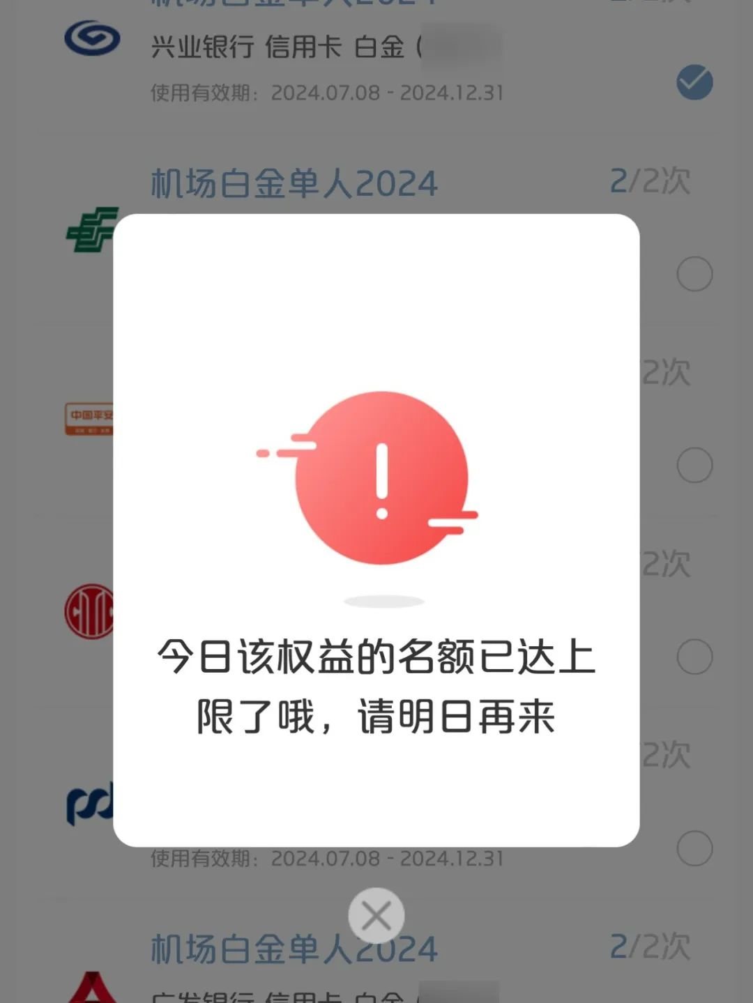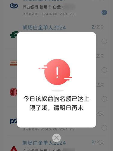 1️⃣ 权益券码仅限当天有效,权益券码使用后才可以购买下一次权益。(所以你只有乘机、乘车当天一次机会抢兑,如果抢不到就没办法了。不过好处是你只需要跟当天有出行计划的持卡人抢,可能容易点了那么微不足道的一点点吧)