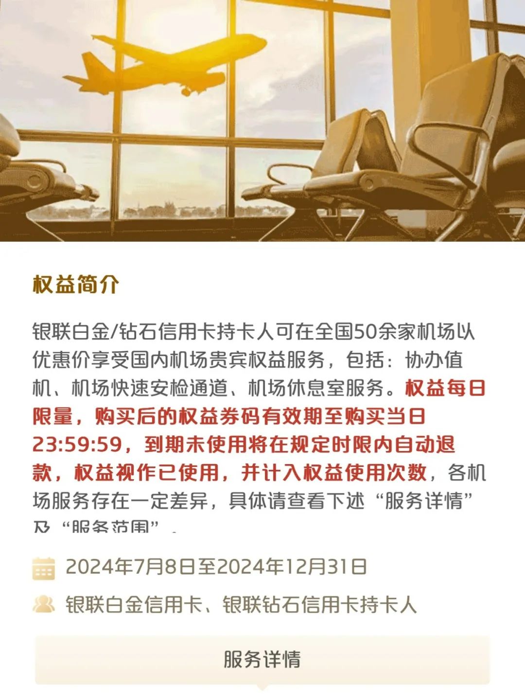 🔑 预定方式:每天 07:00 点击 “立即预定” 按钮抢贵宾室权益(在两个页面分别抢对应的权益),预定并支付完成后可获得权益券码凭证,在合作贵宾室验证券码后使用权益。