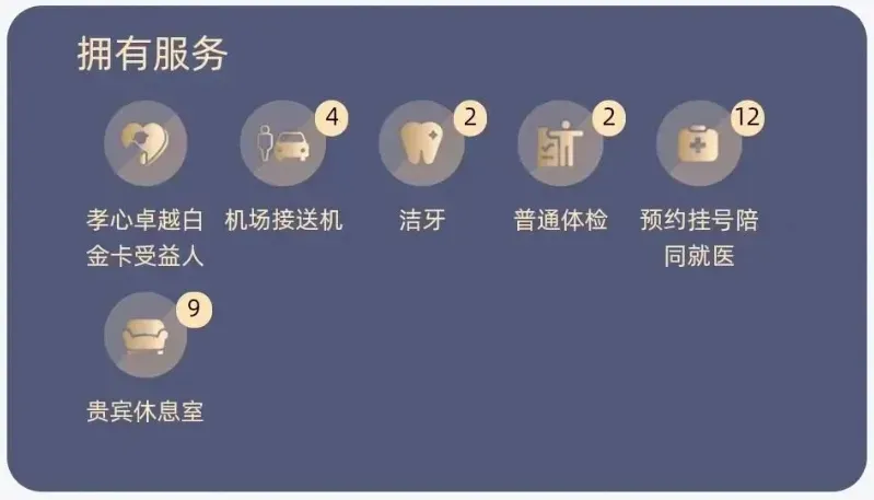 帅帅持有的大白金卡不少,但要说权益最实用,且日常使用最多的大白金卡,那必须是光大的孝心卓越白金卡。龙腾点数够可以无限带人,体检、接送机也都是刚需,每年都用完,另外还能名正言顺地把权益给家人用。