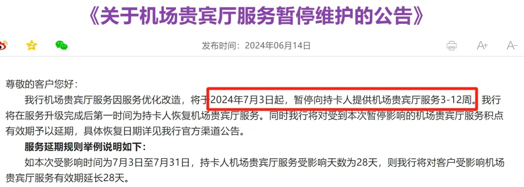 更恶心的是,光大目前还在对龙腾权益进行调整:“2024年7月3日起,暂停向持卡人提供机场贵宾厅服务3-12周。”完美避开暑假使用权益的热门时间段,这操作太骚了。
