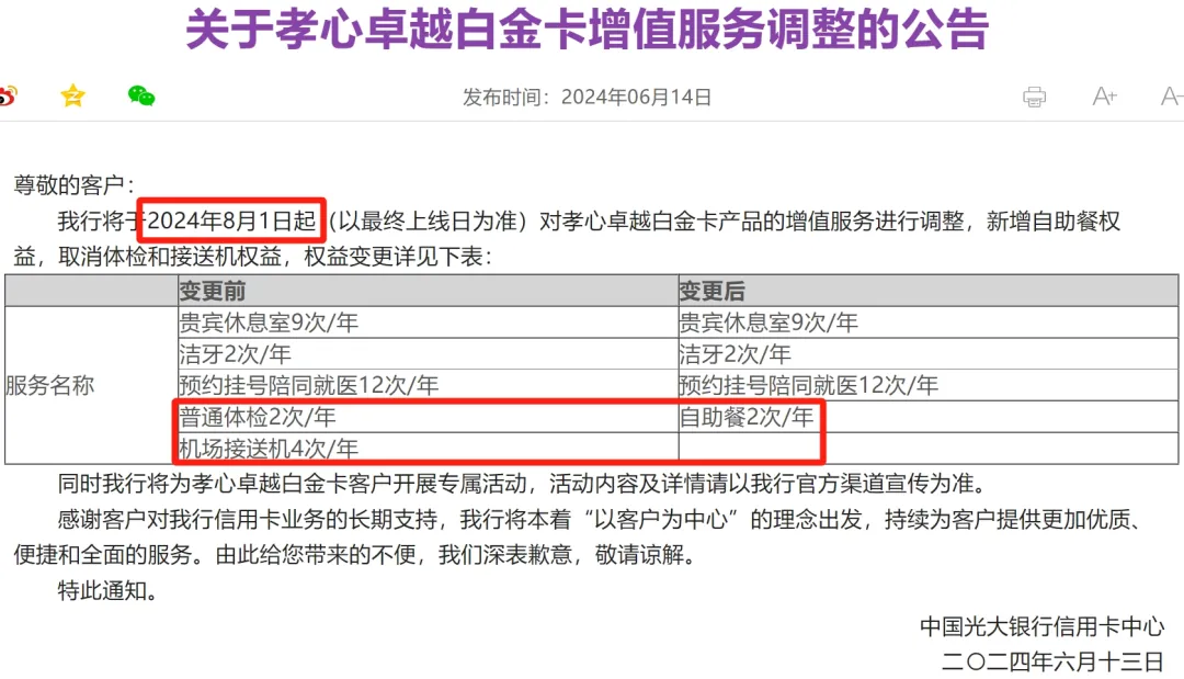 但是今年6月,光大一纸公告,直接砍掉了孝心卓越白的体检和接送机权益。这一刀算是砍到了大动脉,让卡片的性价比直线下降。