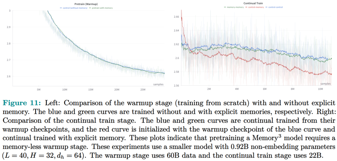两阶段预训练:预训练由两个阶段组成,warmup 和持续训练。只有持续训练阶段涉及显式记忆,而 warmup 阶段使用与普通预训练相同的格式。
