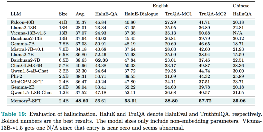 目前,LLM 仍然面临幻觉问题。从概念上讲,Memory3 应该不太容易受到幻觉的影响,因为它的显式记忆直接对应于参考文本。为了评估幻觉,研究者选择了两个英文数据集进行评估。结果如表 19 所示,Memory3 在大多数任务上都取得了最高分。