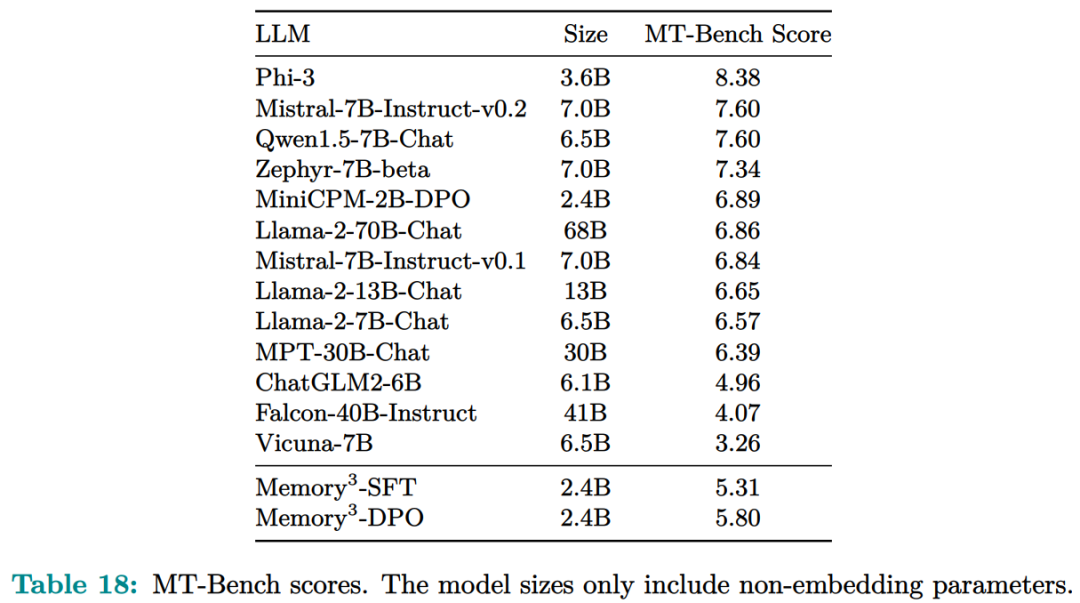接下来作者评估了 Memory3 的对话技巧,结果列于表 18 中,表明模型以更少的参数胜过 Vicuna-7B、Falcon-40B-Instruct 和 ChatGLM2-6B。
