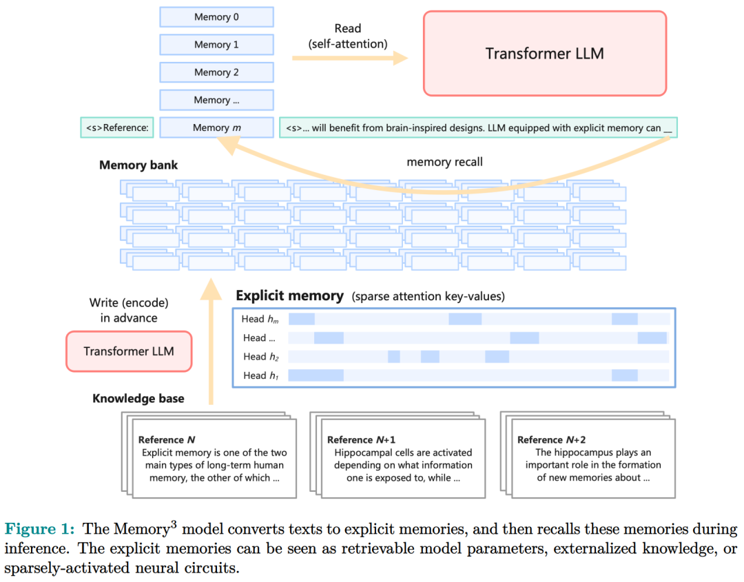 Memory3 在推理过程中利用显式记忆,减轻了模型参数记忆特定知识的负担;