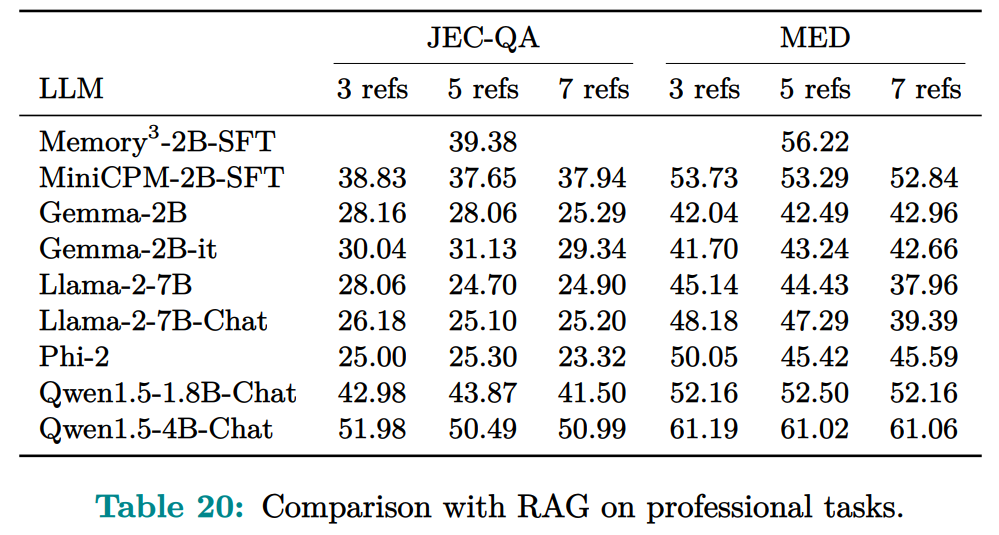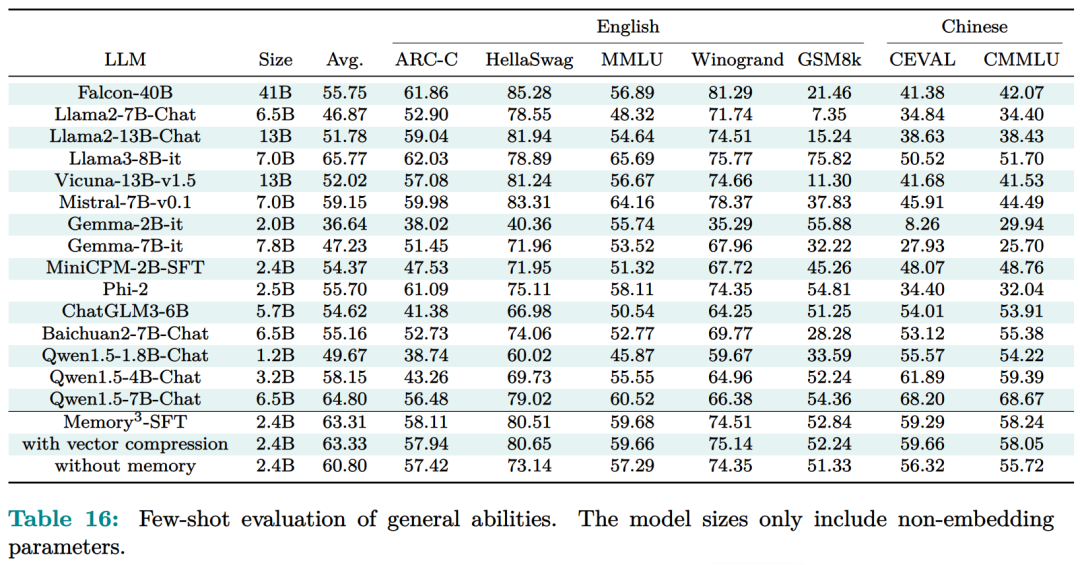 2.4B 的 Memory3比更大的 LLM 和 RAG 模型获得了更好的性能。