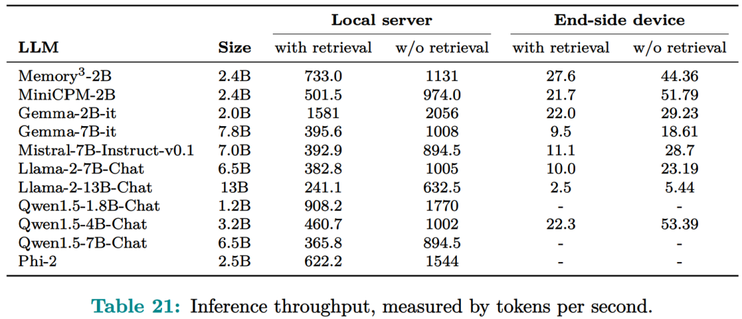 最后,研究者通过每秒生成的 token 数来评估 Memory3 的解码速度或吞吐量。