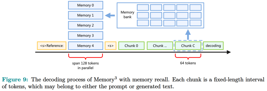 推理过程如图 9 所示,每当 LLM 生成 64 个 token 时,它就会丢弃当前记忆,使用这 64 个 token 作为查询文本来检索 5 个新记忆,并继续使用这些记忆进行解码。同样,在处理提示时,LLM 会为每 64 个 token 块检索 5 个记忆。每个块都会关注自己的记忆,并且不同块之间的记忆可能会有所不同。